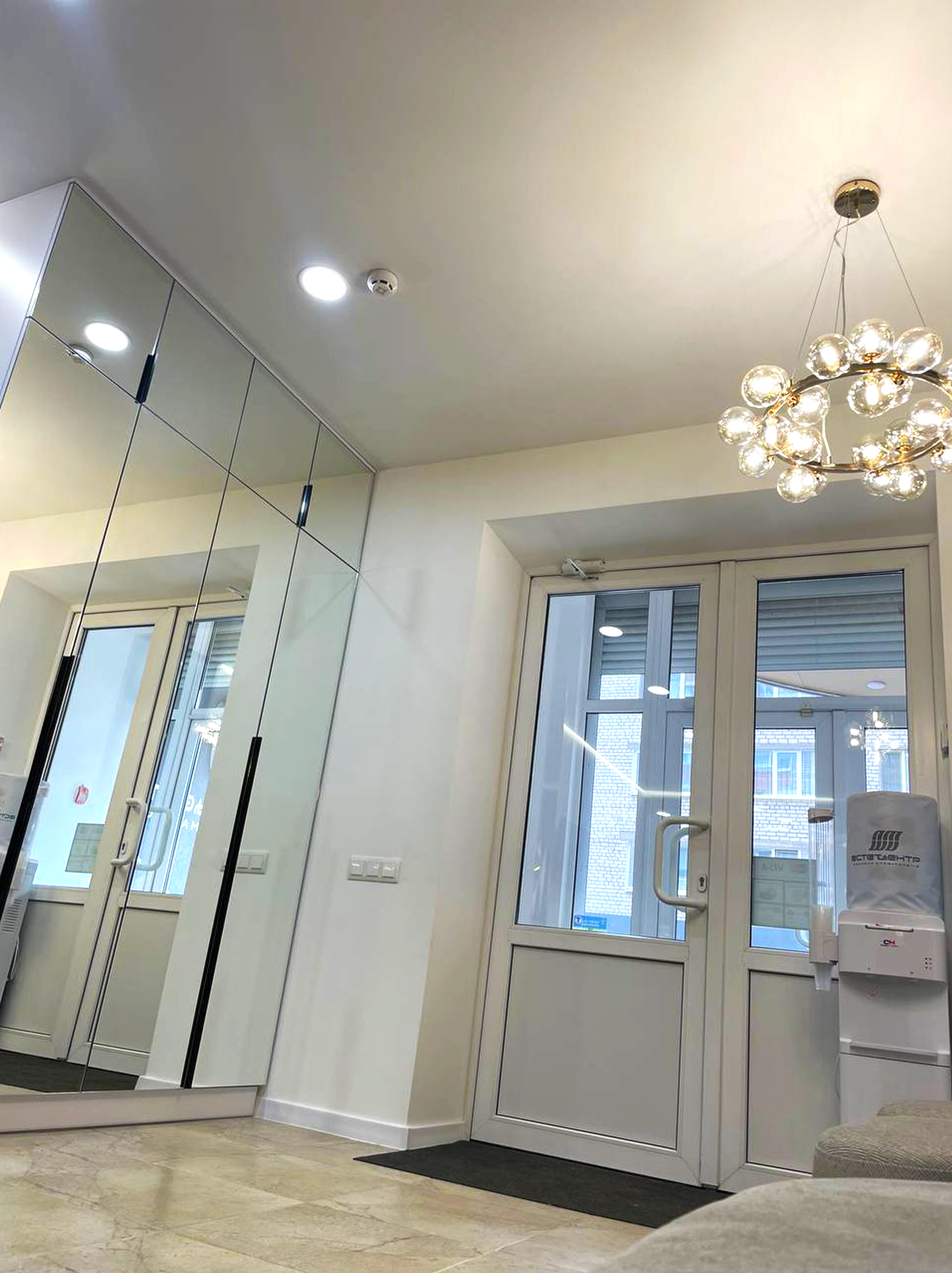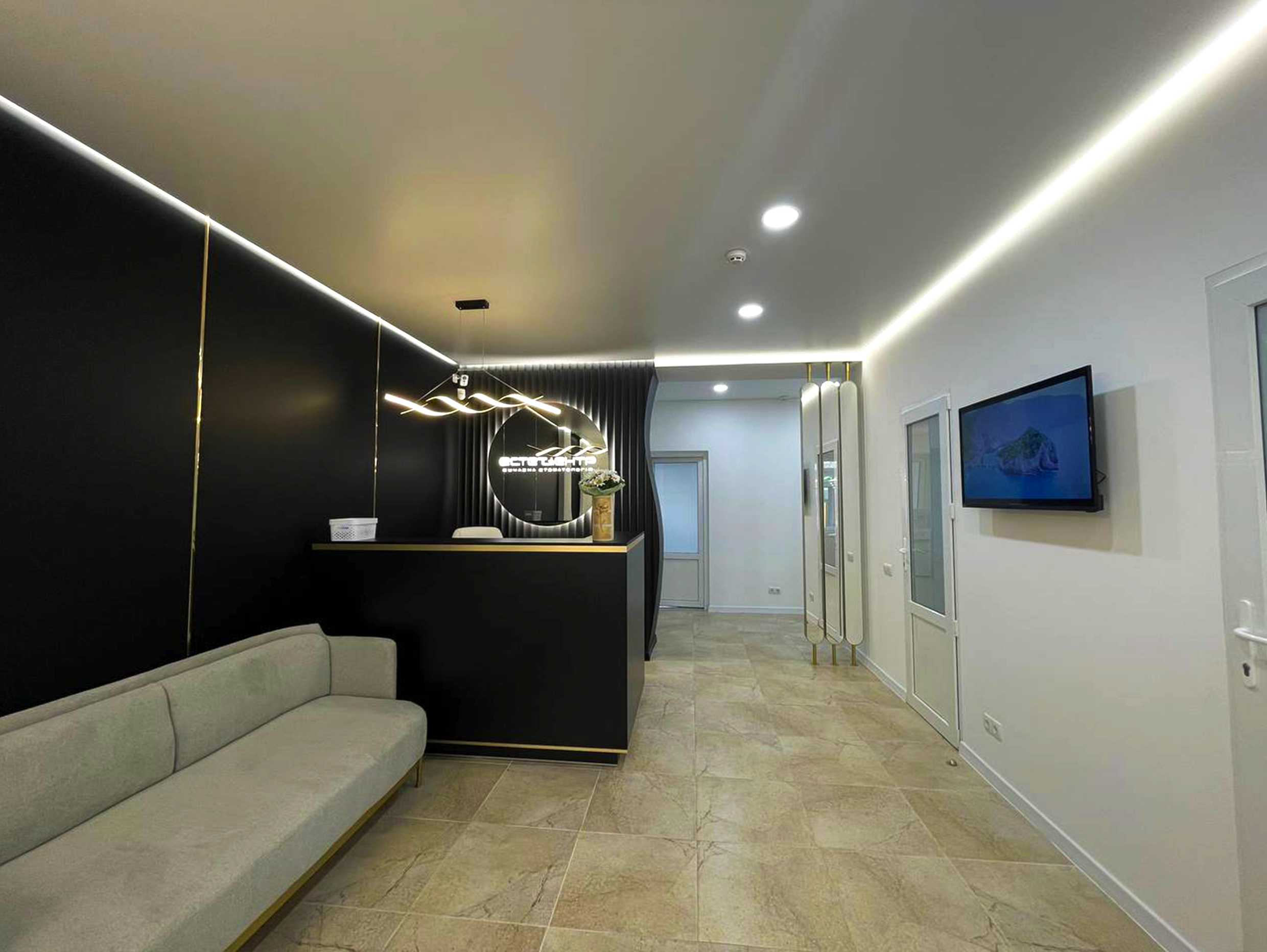 Натяжні стелі забезпечили рівну, бездоганну поверхню, що ідеально поєдналася з сучасним інтер’єром клініки та підкреслила її преміальний вигляд.