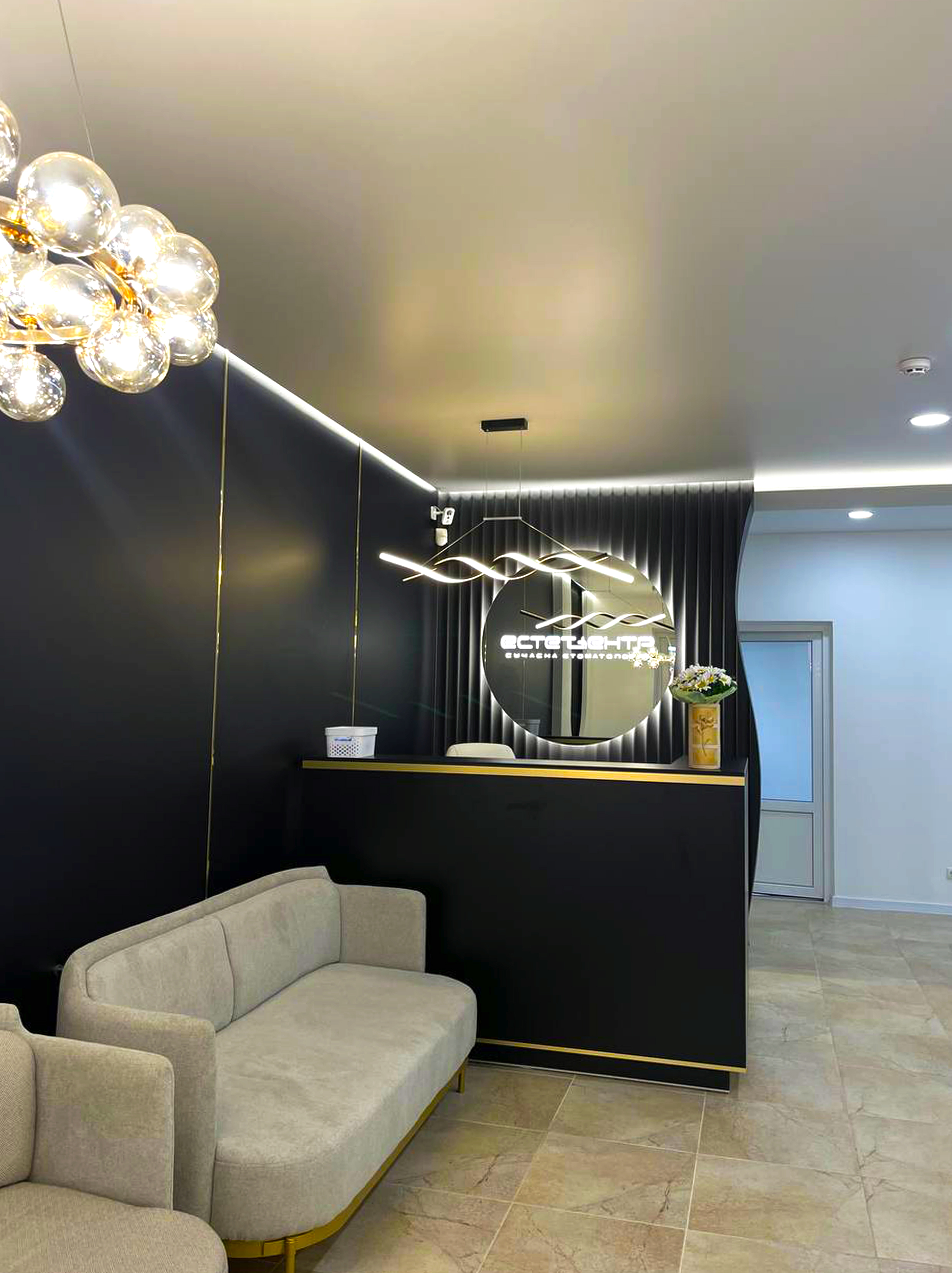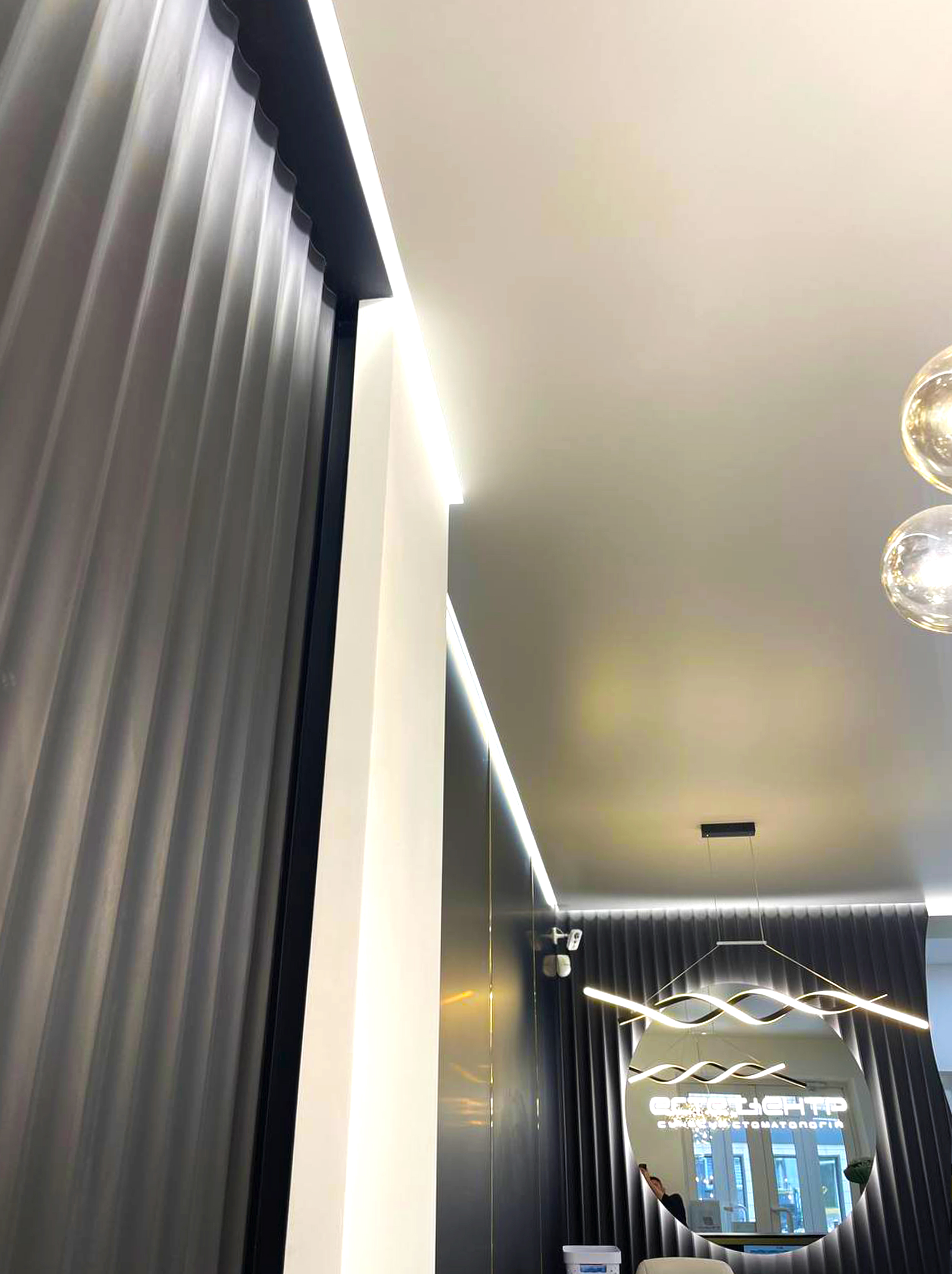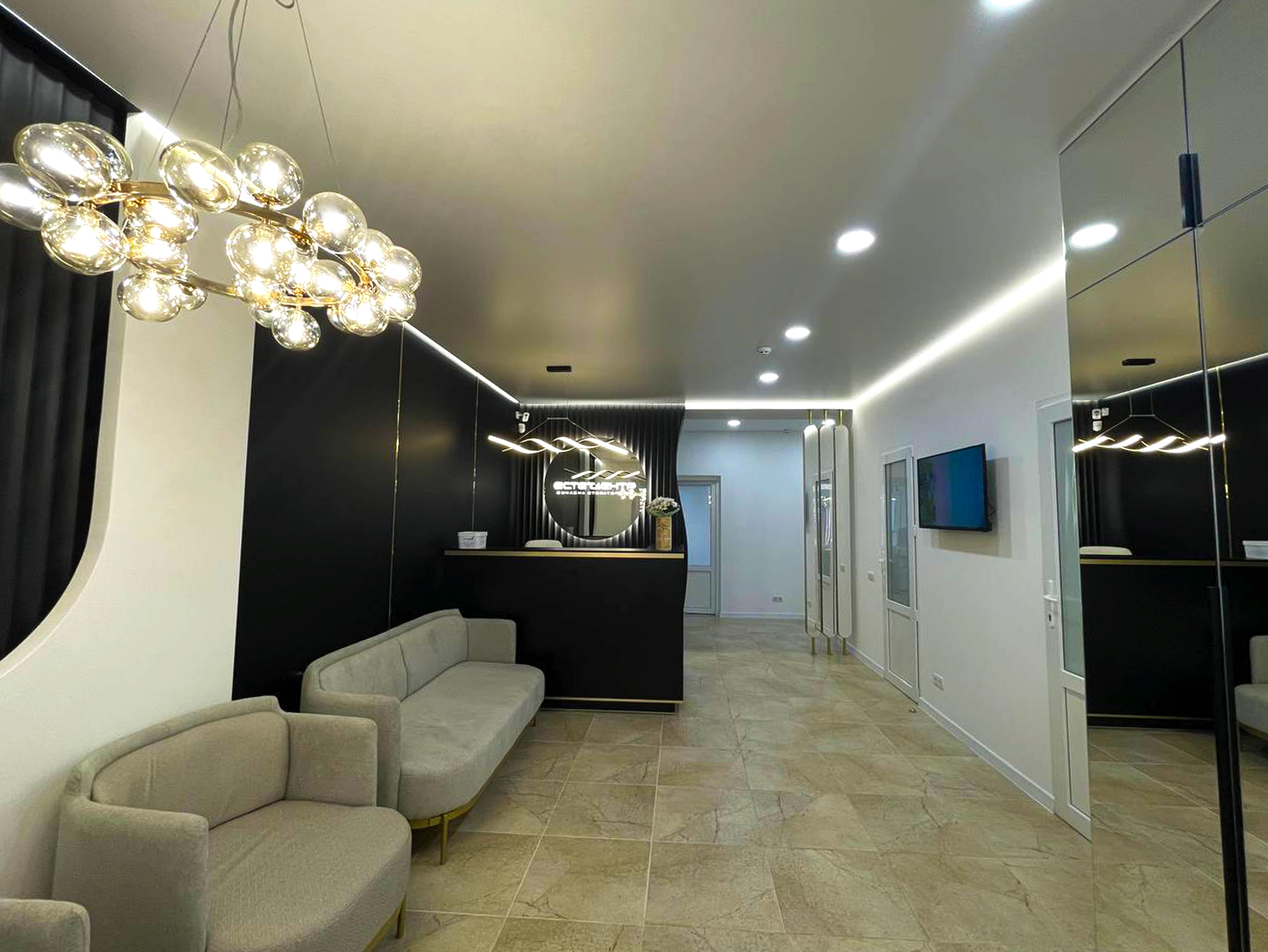 Для цього простору обрали матові та глянцеві натяжні стелі, щоб підкреслити чистоту, стиль та естетику медичного закладу. Завдяки правильно підібраному освітленню – точковим світильникам, дизайнерським люстрам і делікатному LED-підсвічуванню – приміщення стало максимально світлим, комфортним і професійним.