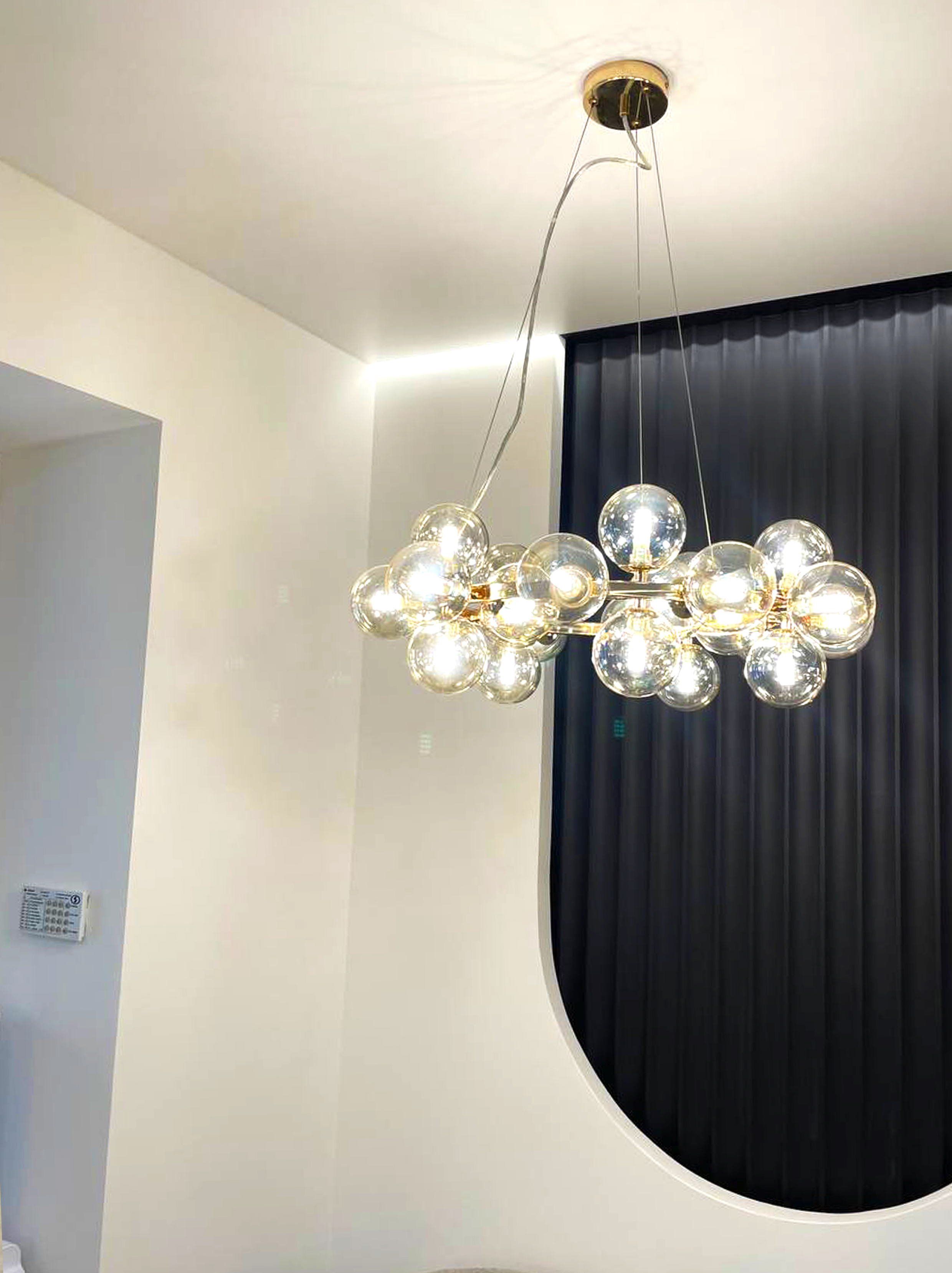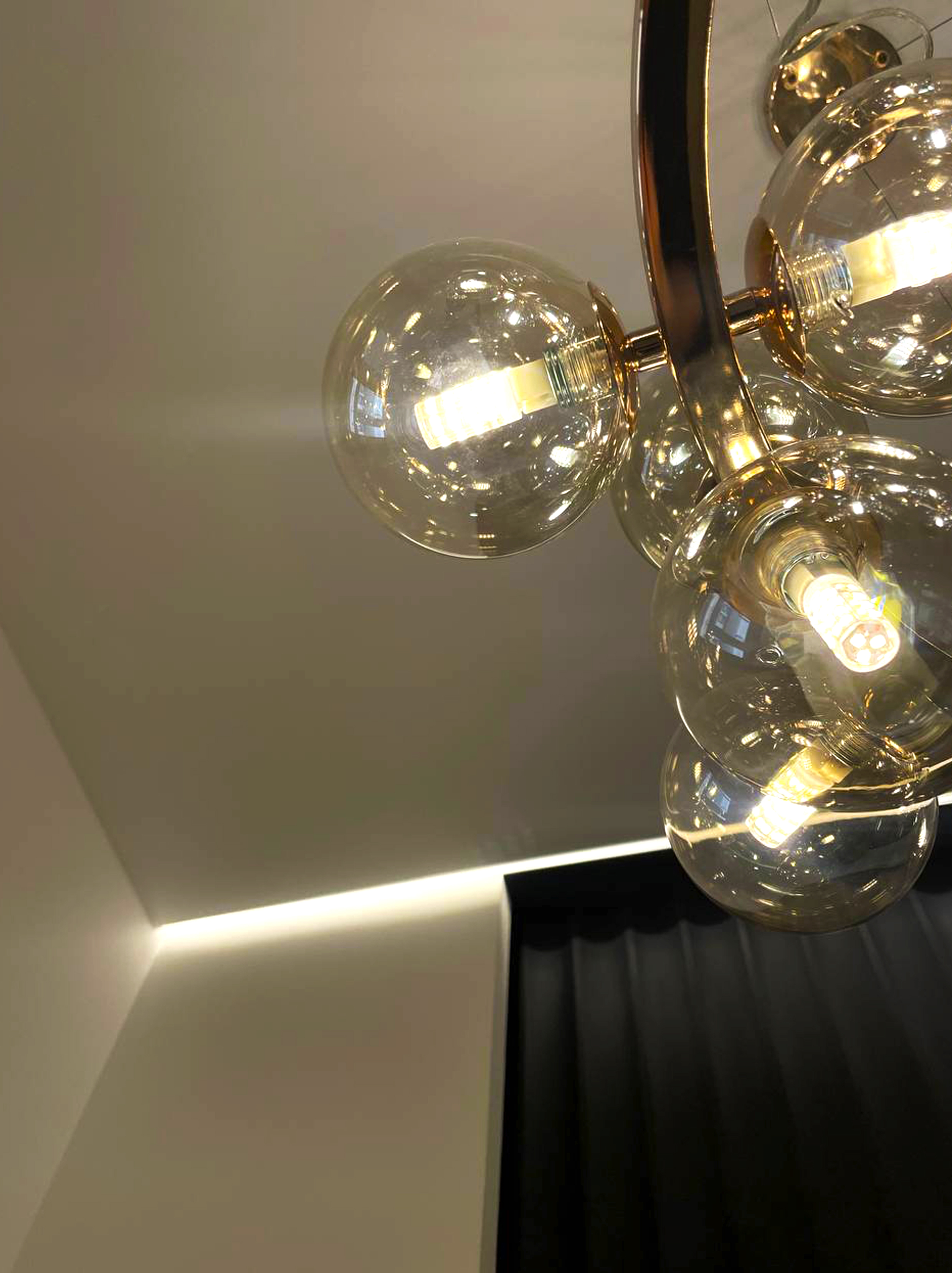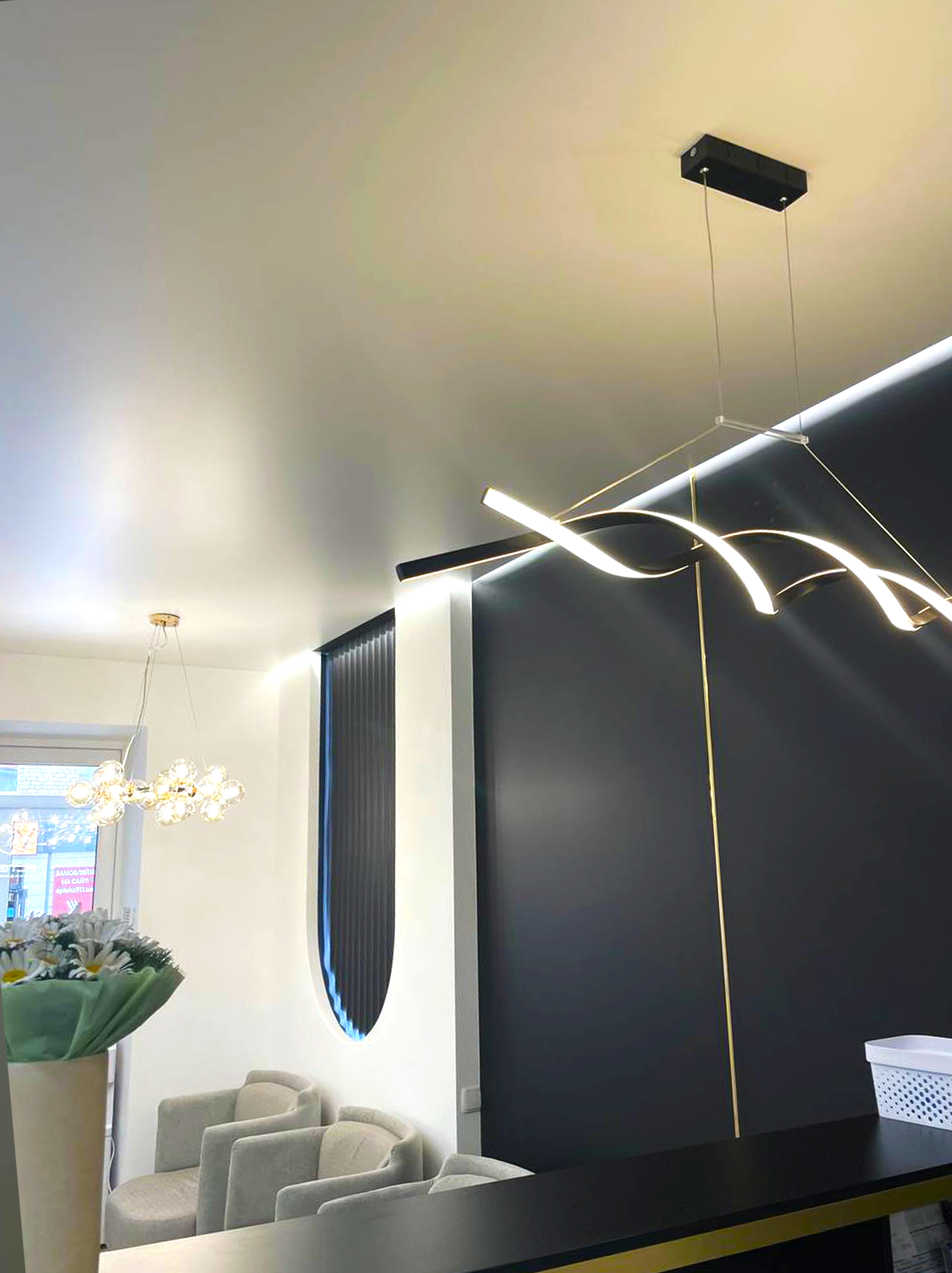 Для цього простору обрали матові та глянцеві натяжні стелі, щоб підкреслити чистоту, стиль та естетику медичного закладу. Завдяки правильно підібраному освітленню – точковим світильникам, дизайнерським люстрам і делікатному LED-підсвічуванню – приміщення стало максимально світлим, комфортним і професійним.