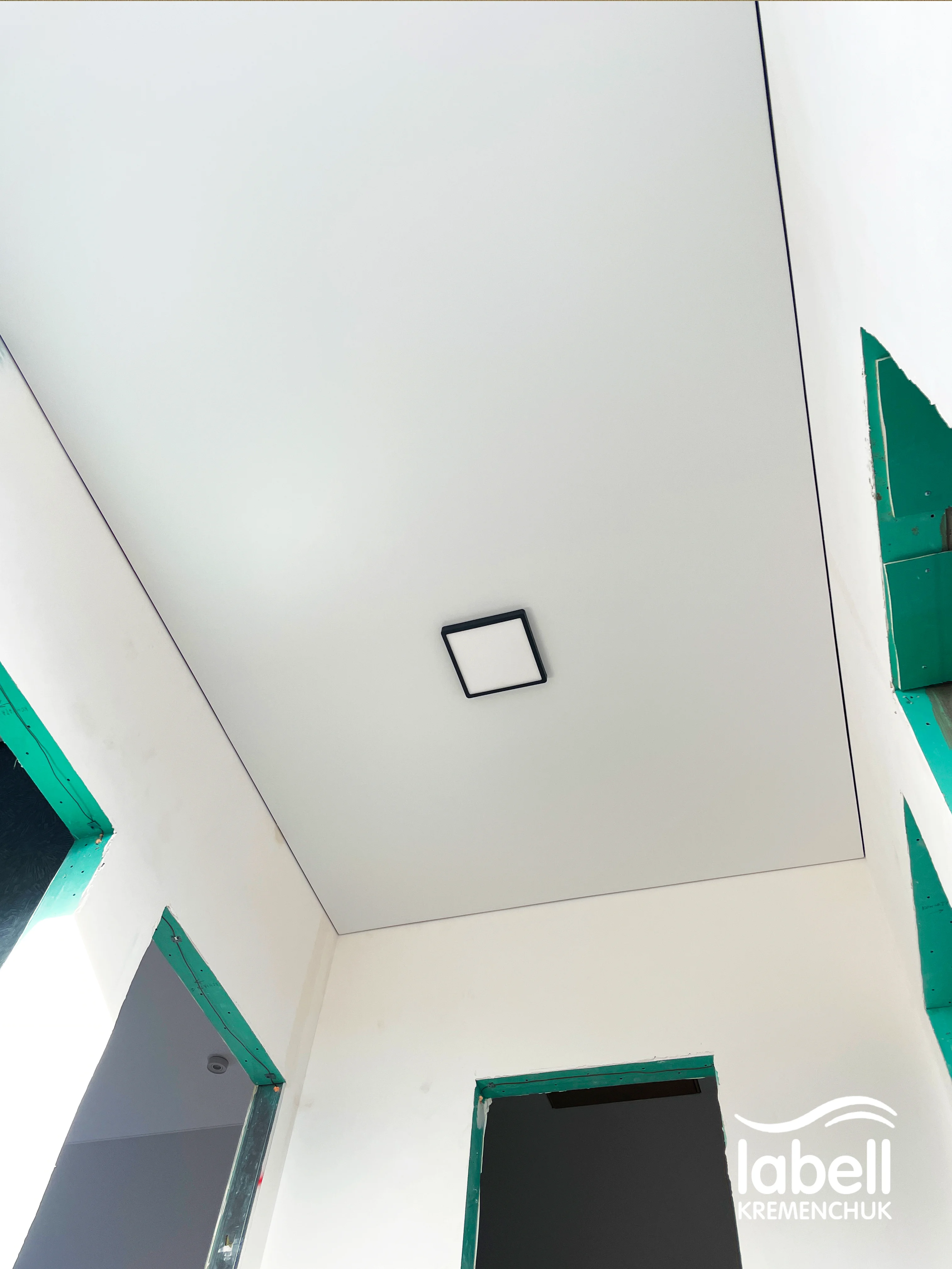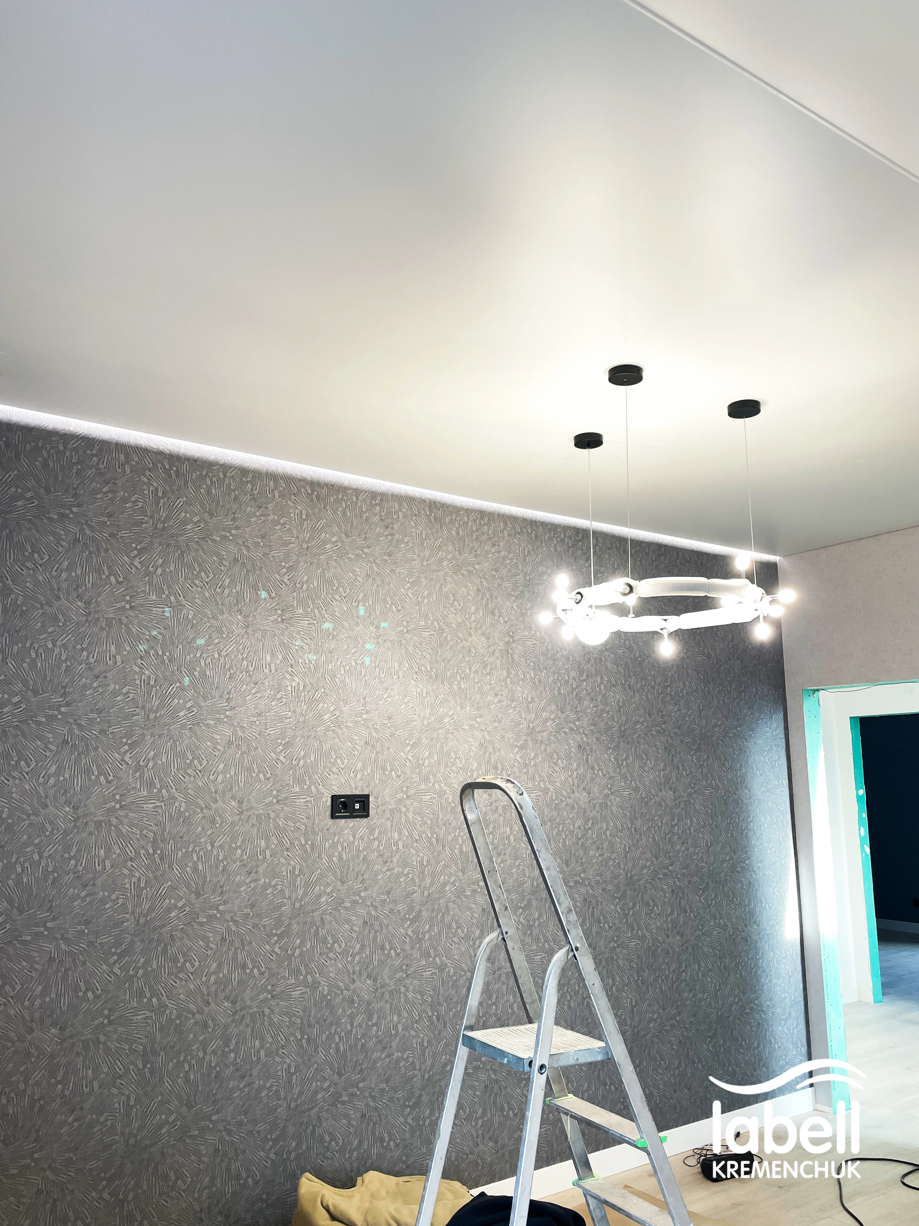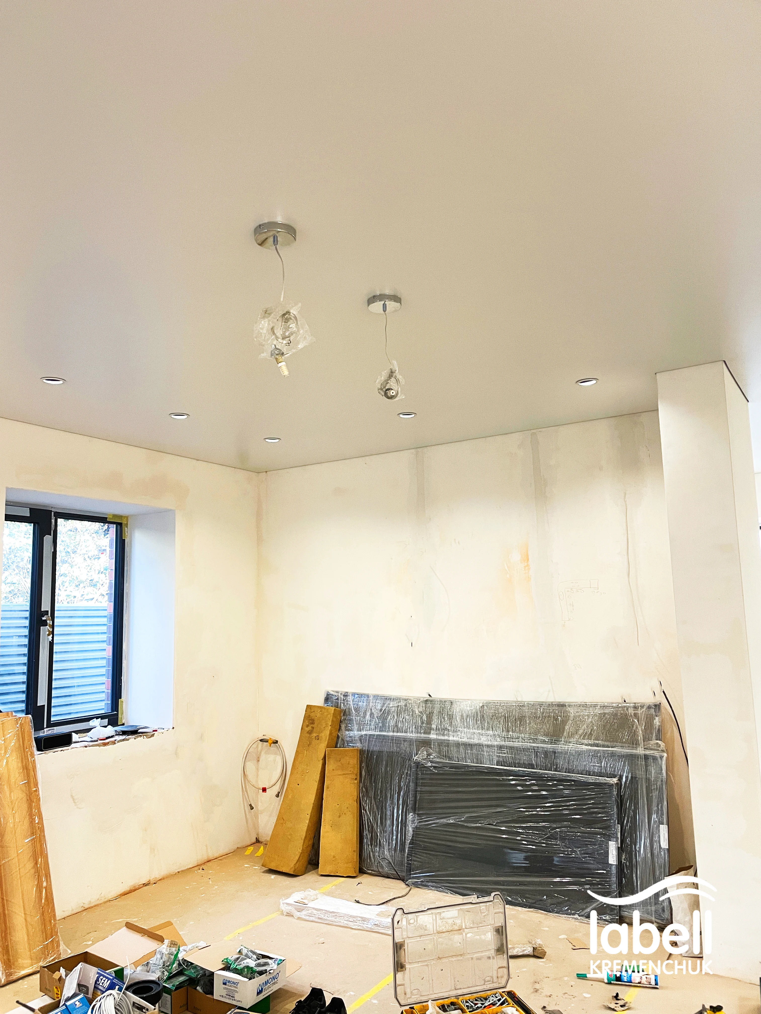 Також підготовано місця під дизайнерські підвісні світильники, які після завершення ремонту доповнять загальну концепцію освітлення. Стеля встановлена в чистий монтаж, з дотриманням усіх нюансів під майбутній декор та меблювання.