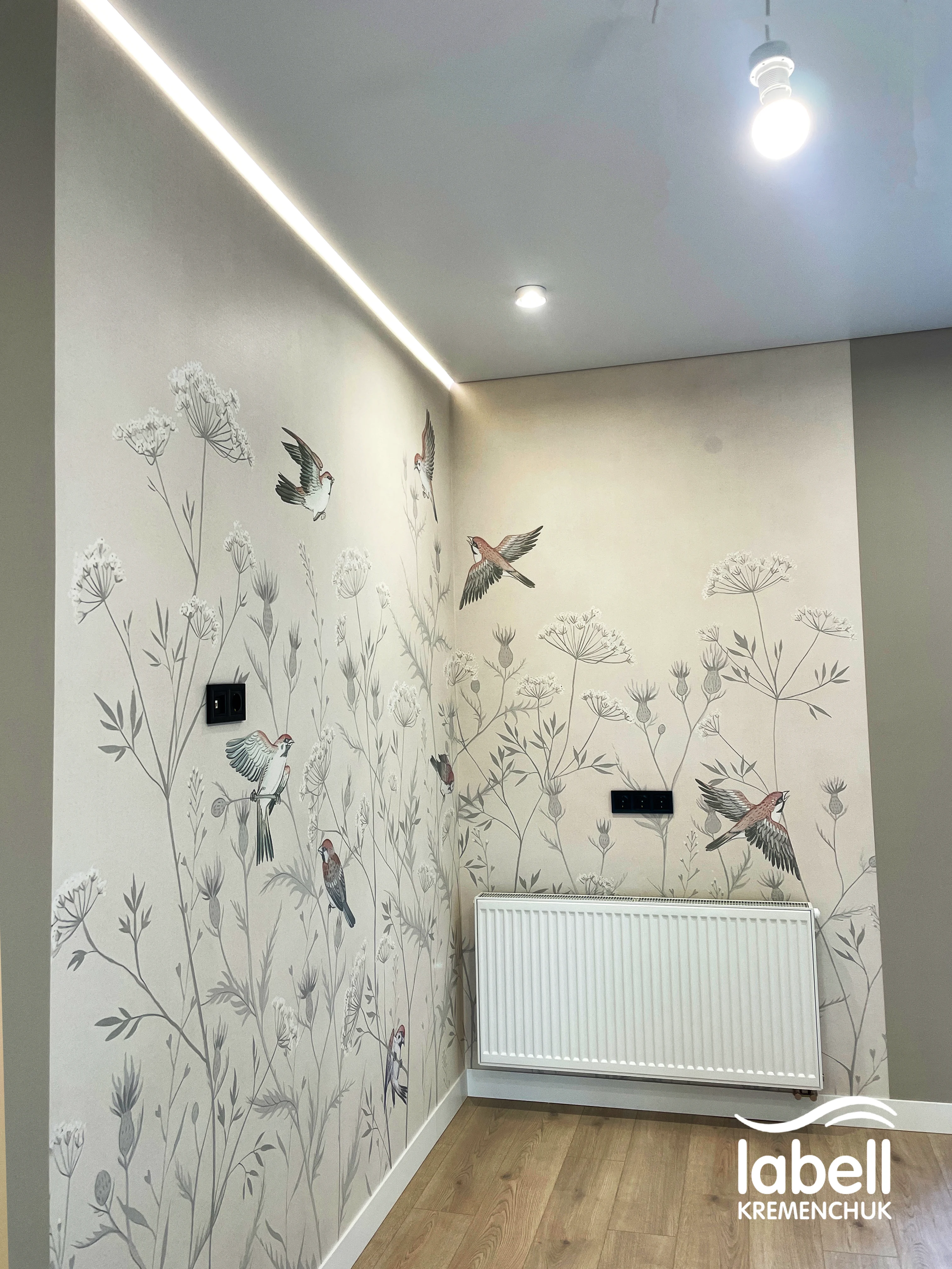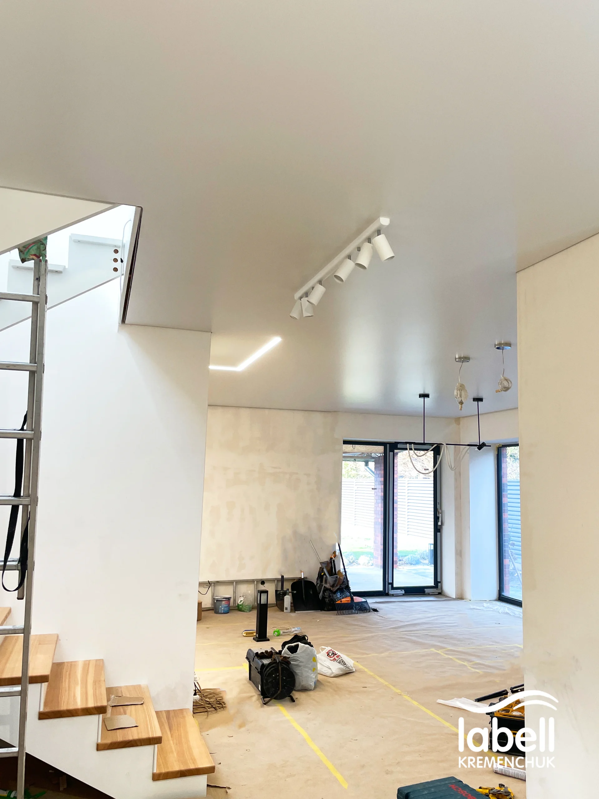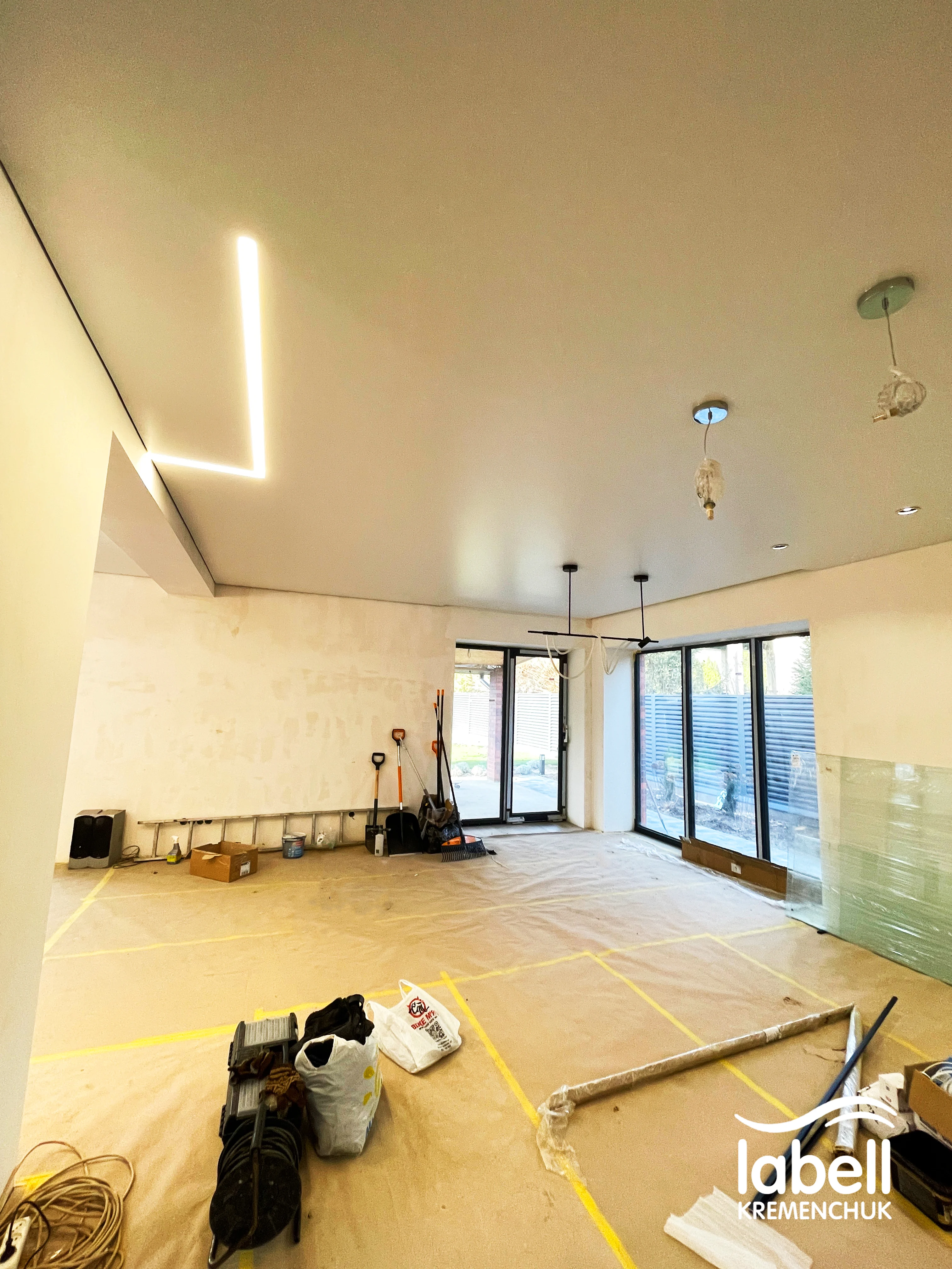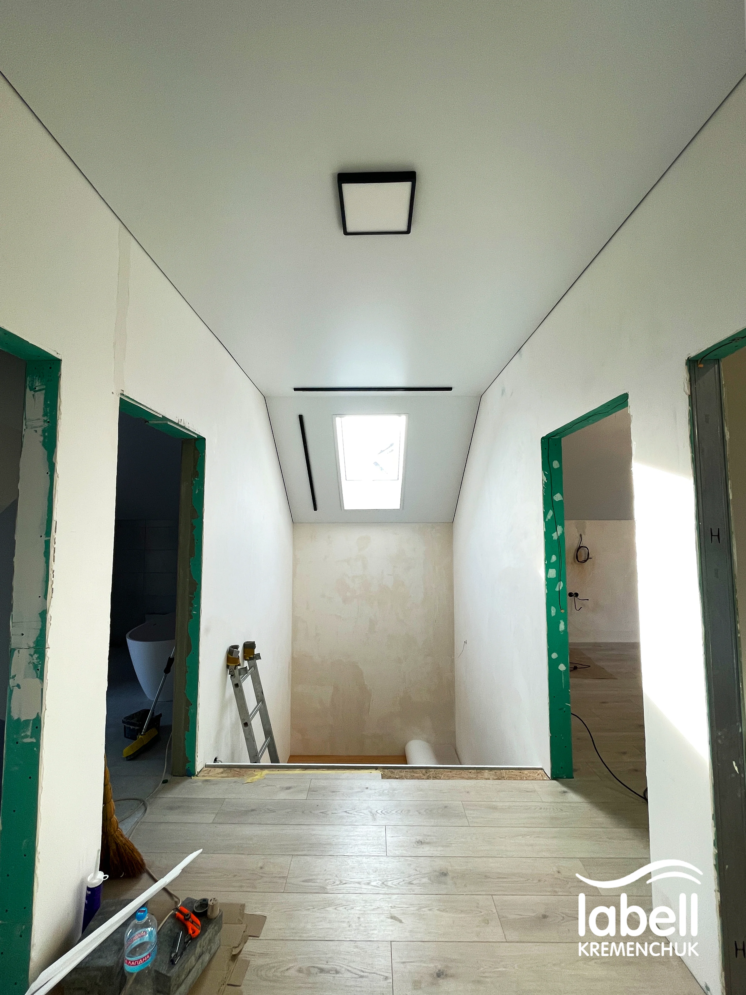Також підготовано місця під дизайнерські підвісні світильники, які після завершення ремонту доповнять загальну концепцію освітлення. Стеля встановлена в чистий монтаж, з дотриманням усіх нюансів під майбутній декор та меблювання.