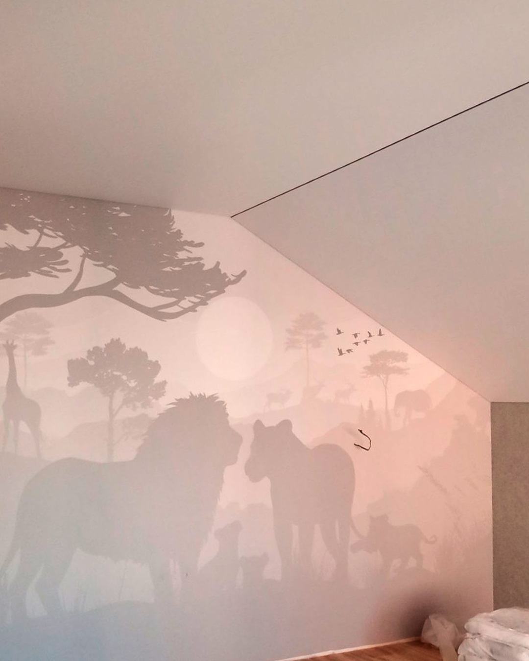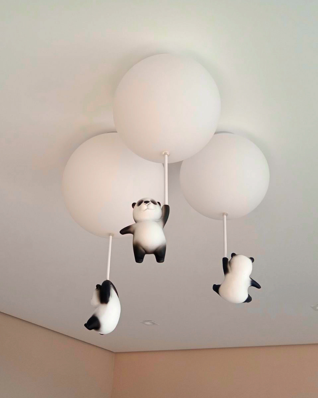 Окрему увагу приділили дитячій кімнаті. Тут матова натяжна стеля забезпечує м’яке, рівномірне світло, а головним акцентом стала дизайнерська люстра у вигляді панд, яка створює атмосферу гри, затишку та справжньої казки для дитини.