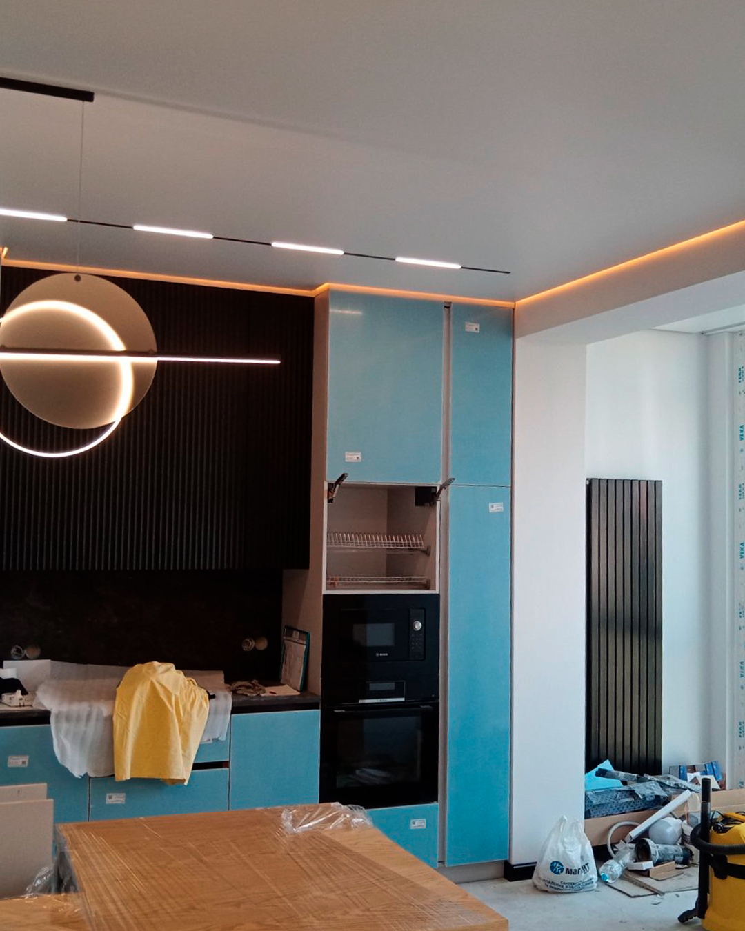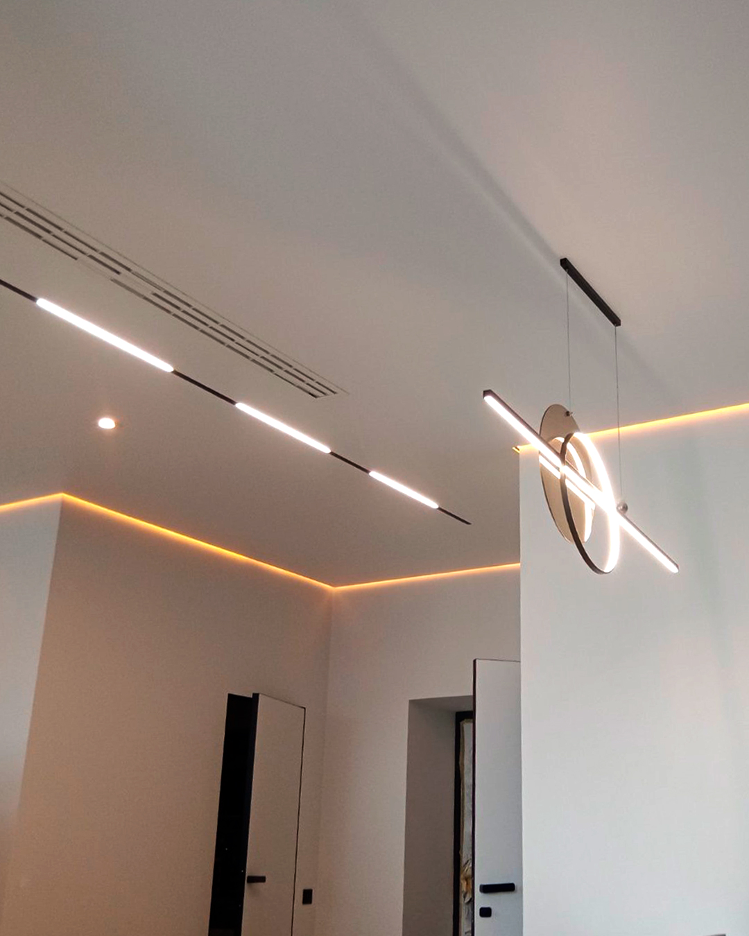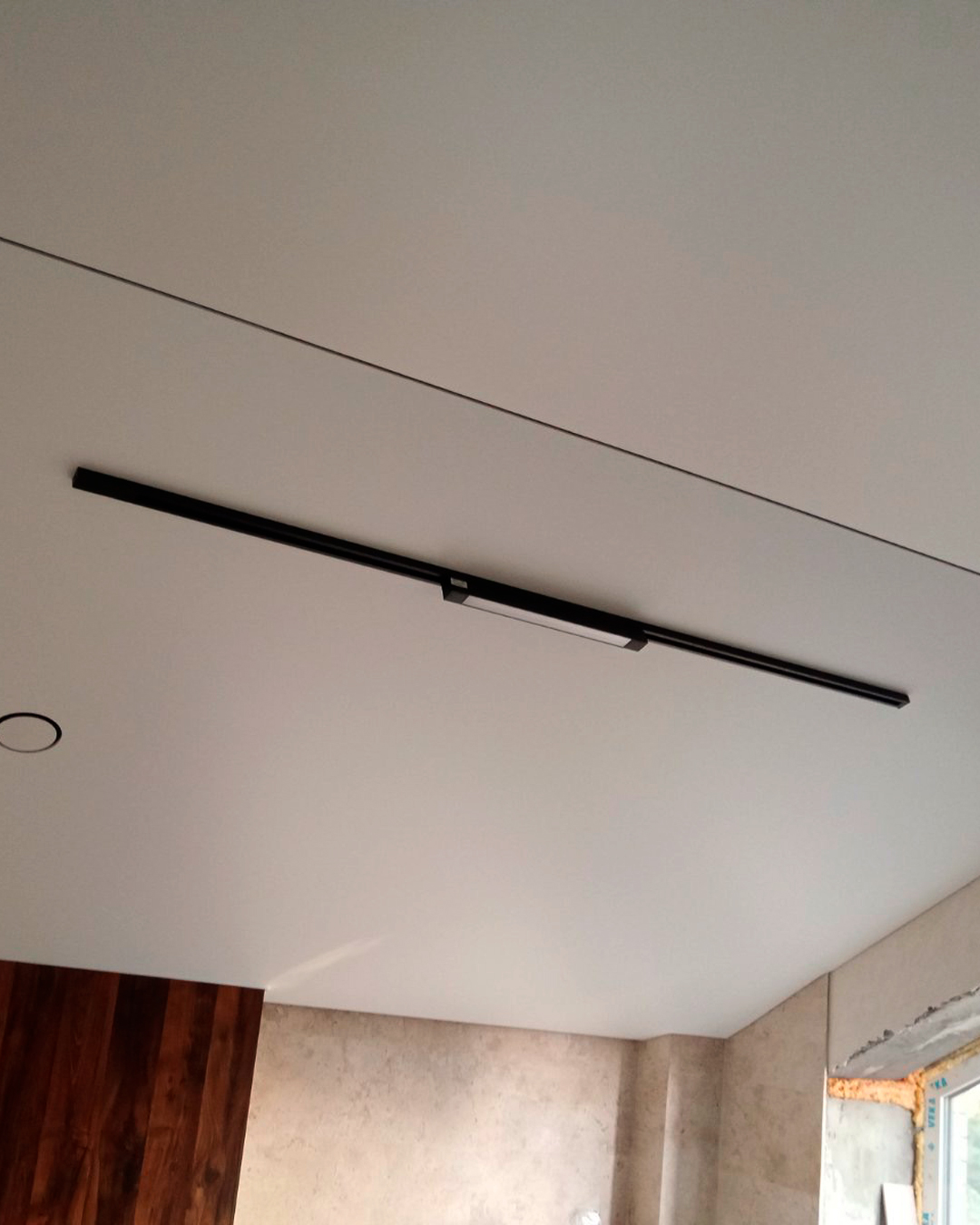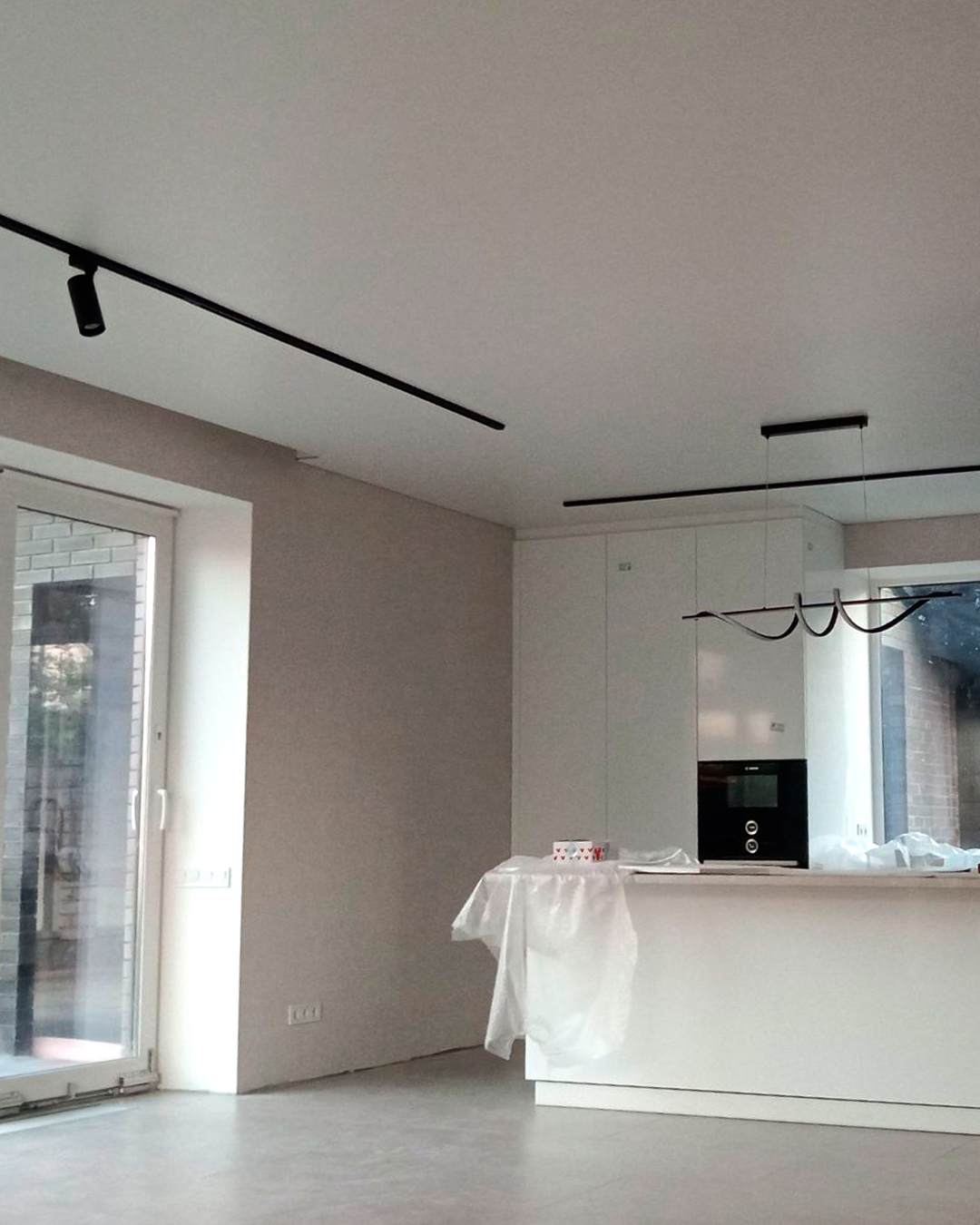 У цьому проєкті в Кременчуці ми встановили матові натяжні стелі, які підкреслили сучасний інтер’єр і чисту геометрію простору. Стелі гармонійно поєднані з трековими світильниками, декоративною люстрою та контурною LED-підсвіткою, що дозволяє зонувати приміщення, змінювати сценарії освітлення та зберігати відчуття простору й мінімалізму.