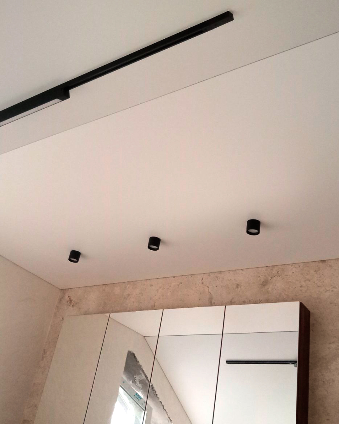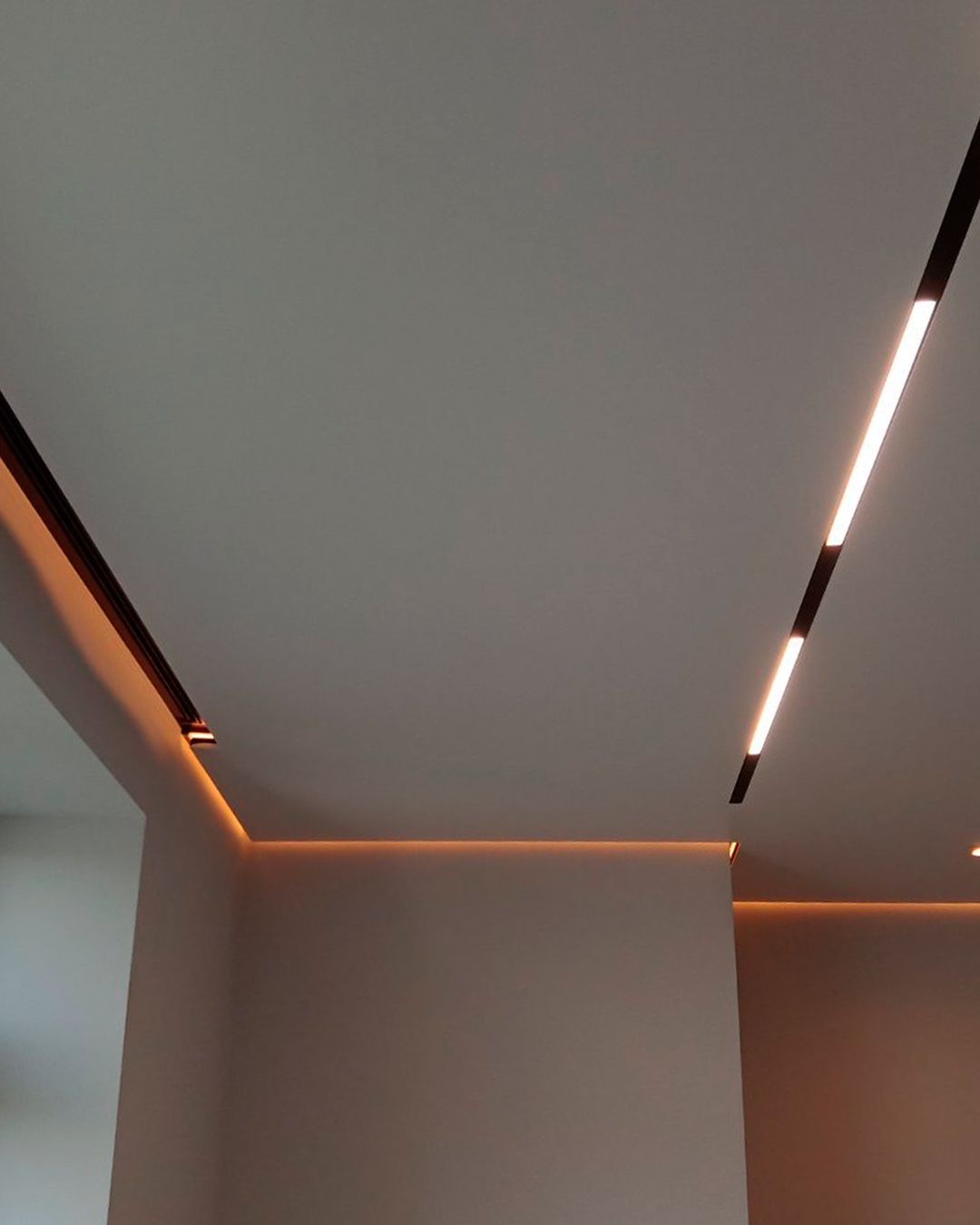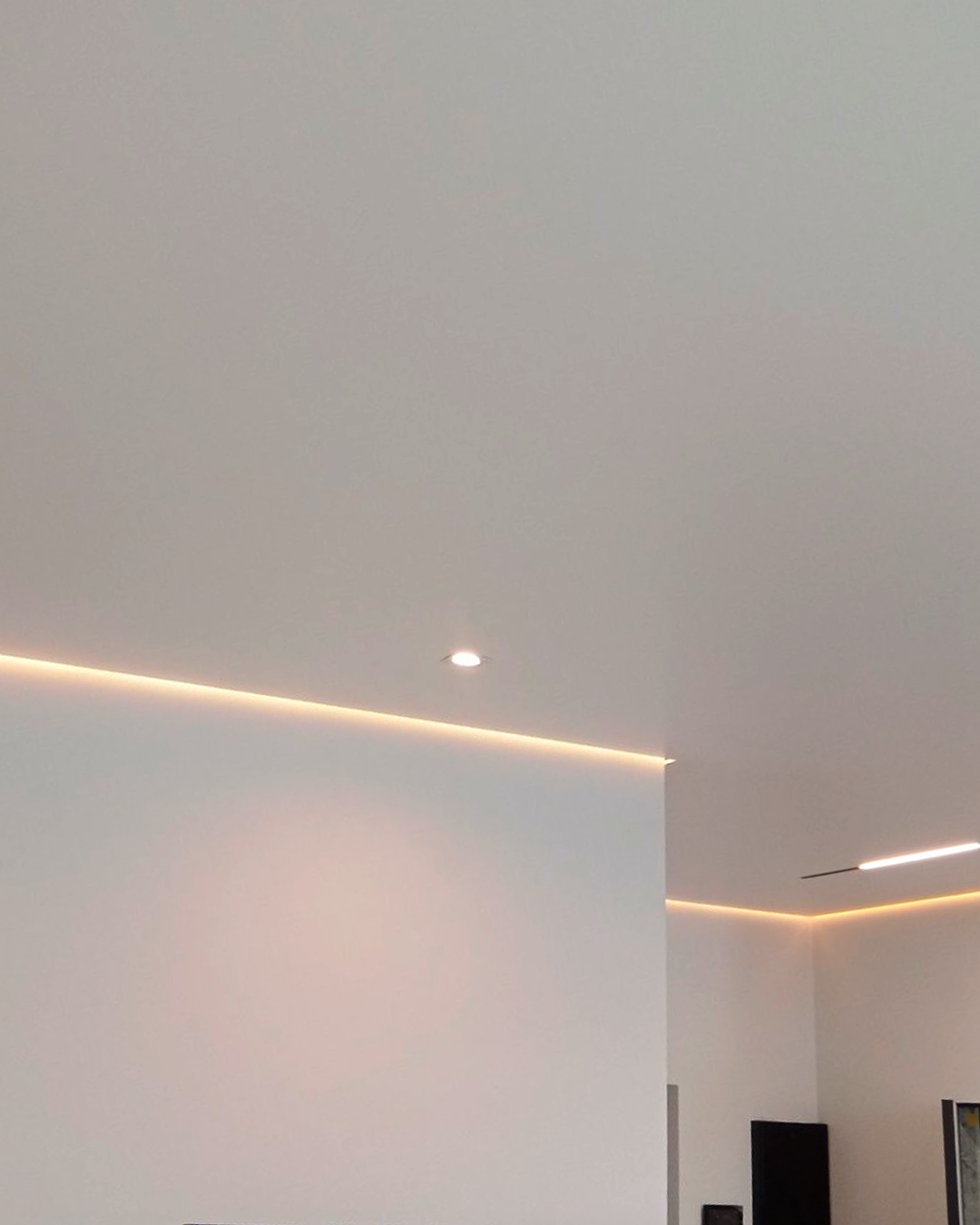 У цьому проєкті в Кременчуці ми встановили матові натяжні стелі, які підкреслили сучасний інтер’єр і чисту геометрію простору. Стелі гармонійно поєднані з трековими світильниками, декоративною люстрою та контурною LED-підсвіткою, що дозволяє зонувати приміщення, змінювати сценарії освітлення та зберігати відчуття простору й мінімалізму.