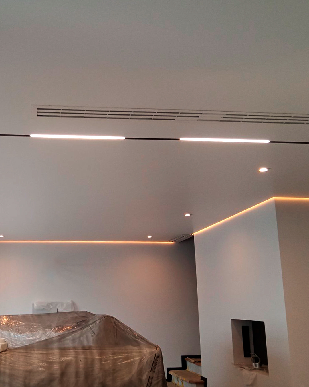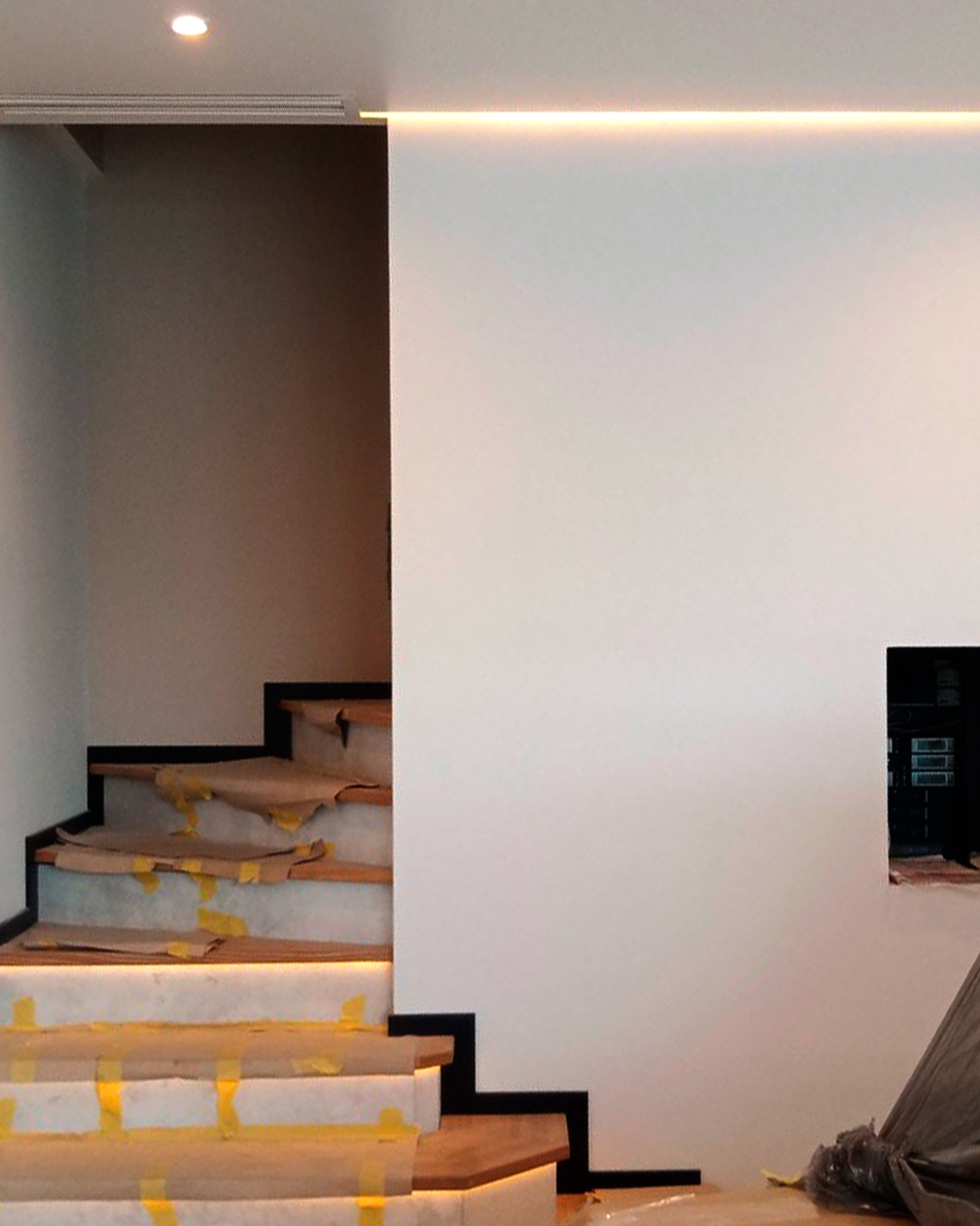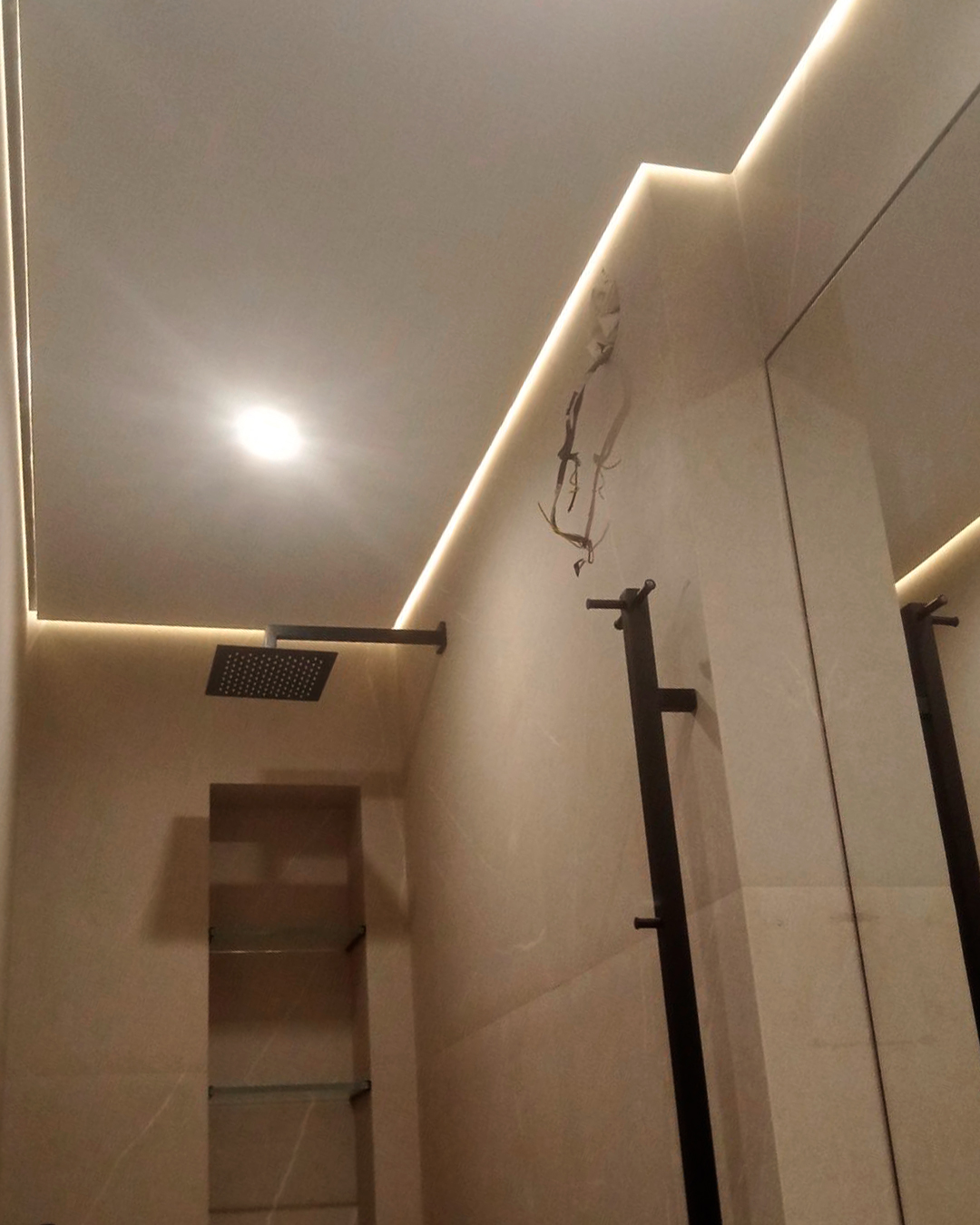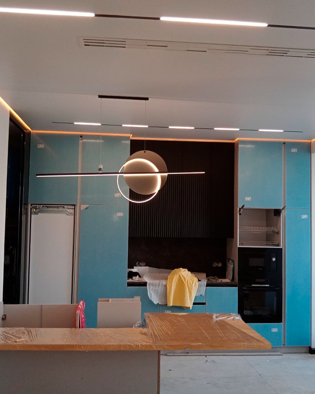 У цьому проєкті в Кременчуці ми встановили матові натяжні стелі, які підкреслили сучасний інтер’єр і чисту геометрію простору. Стелі гармонійно поєднані з трековими світильниками, декоративною люстрою та контурною LED-підсвіткою, що дозволяє зонувати приміщення, змінювати сценарії освітлення та зберігати відчуття простору й мінімалізму.